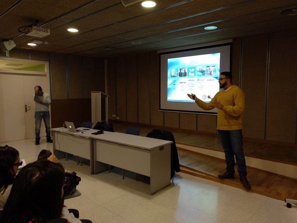 Amb la sala del complex educatiu plena de pares i nens divendres dia 1 de Desembre els col·legiats Sergio Galindo (Arbitre internacional FINA) i Alex Marquez (Arbitre RFEN) van donar una classe magistral dels trets més importants a l’hora de xiular un partit de waterpolo.